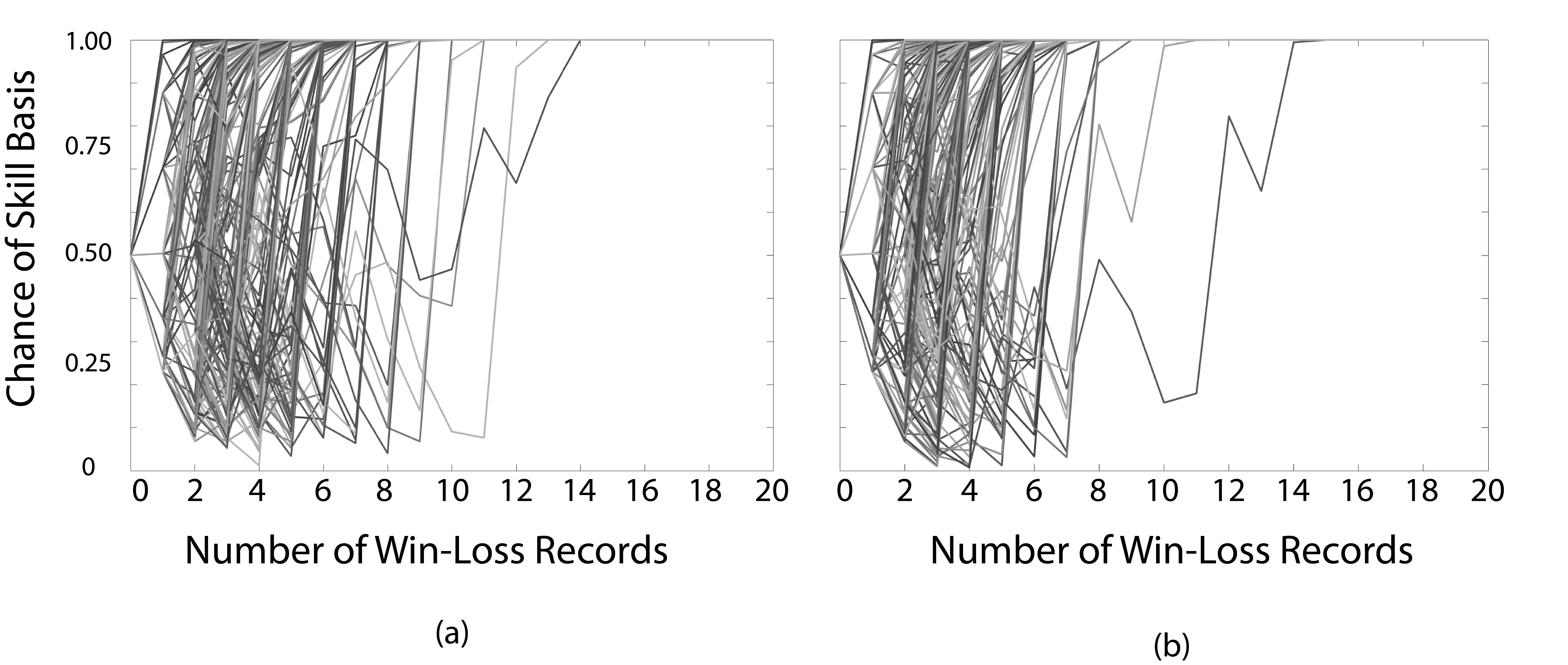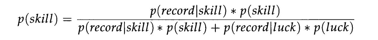 The second approach, which uses Bayesian statistics, is slightly more straightforward. In the most oversimplified terms, you effectively start with the prior assertion that a given sport is 50% skill-based, p(skill), as a starting point— for reference p(luck) is just 1-p(skill). You then update the prior iteratively by feeding individual win-loss records into the equation below one after another. Every win-loss record increases or decreases the prior, p(skill), and for a game where skill out-powers luck to determine game outcomes, eventually p(skill) converges to 1.0, indicating a 100% chance that the game is determined predominantly by skill.